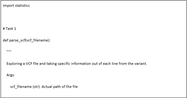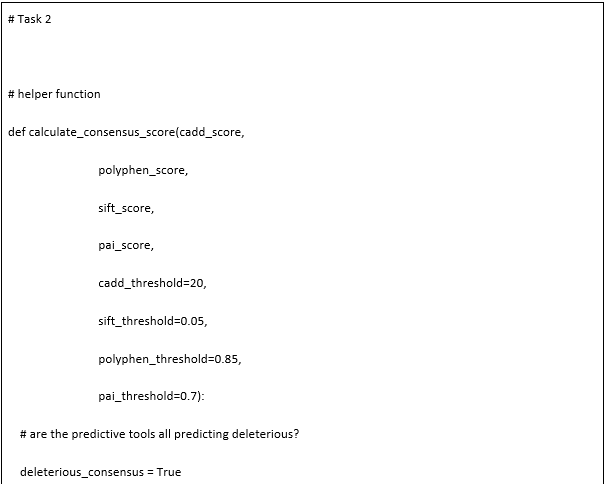 In this task, you will implement a function named disease_variant_score() that will take a number of variant annotations as input and return a score calculated with the equation below. This score will be used in Tasks 3 & 4 to rank and filter genetic variants. Here we will impute the effect of a given genetic variant with a linear regression model: y = b1*(1 – AF) + b2*(10 – functional_constraint_bin) + b3*consensus_score + b4*is_phenotypic where y is the model estimate (which we can call the disease_variant_score) and b1 to b4 are coefficients (provided in the code template function signature). The model features are annotation values you parse (with parse_vcf()) from the input VCF files: