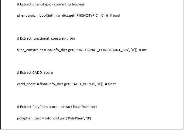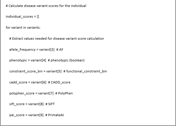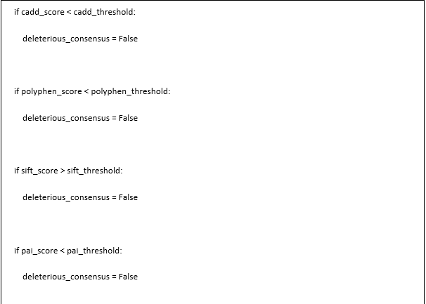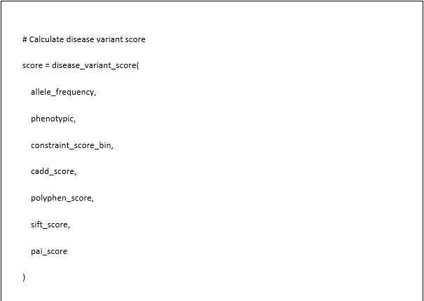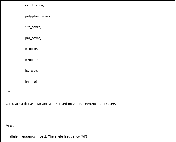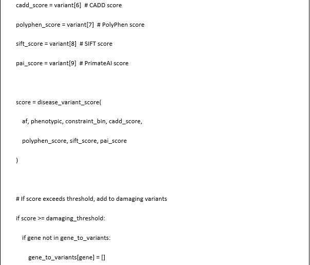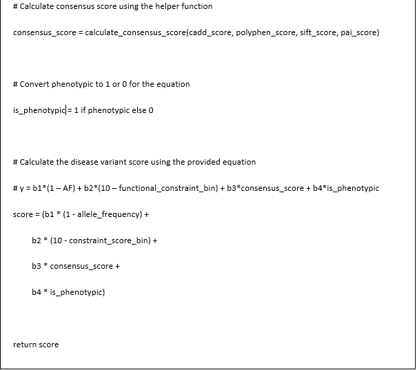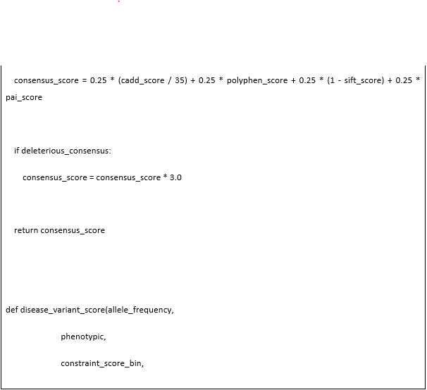 This code segment defines two Python functions for genetic variant analysis: calculate_consensus_score() and disease_variant_score(), which work together to evaluate the potential pathogenicity of genetic variants. The calculate_consensus_score() function serves as a helper that integrates predictions from four different computational tools (CADD, PolyPhen, SIFT, and PrimateAI) to determine if a variant is likely harmful; it accepts scores from each tool along with configurable thresholds for each predictor (defaulting to established values in the field), and implements a two-part scoring system - first determining if all tools agree the variant is deleterious by comparing each score against its respective threshold, then calculating a weighted average of normalized scores where CADD is divided by 35 and SIFT is inverted (since lower SIFT scores indicate deleteriousness, unlike the other metrics); importantly, if all tools agree the variant is harmful, the function triples the consensus score to emphasize this agreement. The main function, disease_variant_score(), calculates an overall pathogenicity score by combining multiple genetic parameters: allele frequency (rarity of the variant), phenotypic association status (whether the gene is linked to disease), functional constraint (how evolutionarily conserved the region is), and the consensus prediction score from the helper function; it implements a weighted linear regression model with four coefficients (b1=0.05, b2=0.12, b3=0.28, b4=1.0 by default) that balance the contribution of each parameter. The disease score is calculated in a specific formula b1 * variant's rarity (minus allele frequency), b2 * inverse constraint bin (10 bin value minus the bin value, bins below 10 indicate higher constraint), b3 * consensus deleteriousness score, b4 * if the gene is associated to phenotypic associations (1 if yes, 0 if no). It provides a high score calculated through population genetics (allele frequency), evolutionary biology (constraint), computational guessing (consensus score), and clinical knowledge (phenotypic associations) for detection of those variants which are most likely to be responsible for disease. The relatively higher weight (b4=1.0) assigned to phenotypic associations indicates this factor's particular importance in determining pathogenicity, while the lowest weight (b1=0.05) for allele frequency suggests it contributes less significantly to the final determination, though rare variants are still favored over common ones in the scoring model.