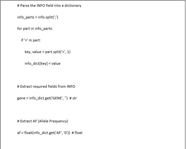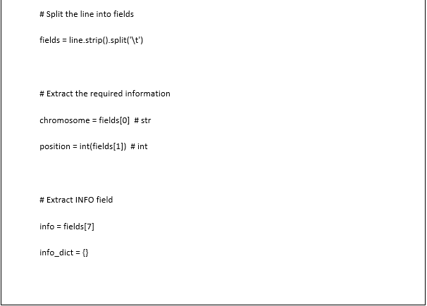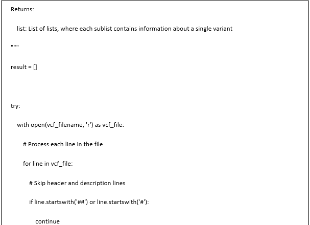 Develop a function to read an individual VCF file. Name the function parse_vcf(). This function takes as input the full file path and name of a single input VCF file and works through each line to parse the information contained therein. You should ignore the description and header lines in the input VCF file (ie. lines beginning with either ‘##’ or ‘#’). This function will return a list of lists. The top-level list will contain sub-lists that each contain the information describing a single genetic variant (a single VCF line) and will contain the following information in each list element, in order (please pay attention to the variable types for each stored value, and cast these to the correct type where necessary):