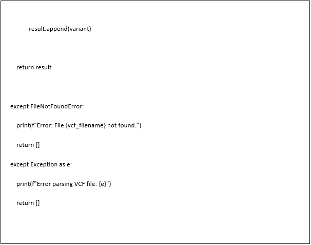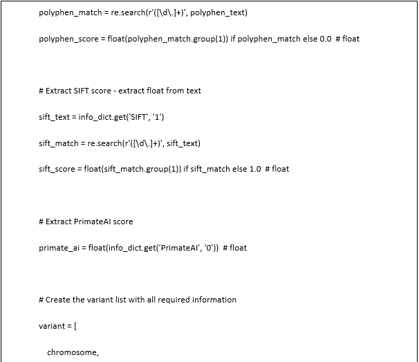 This Python code defines a single function parse_vcf() that processes Variant Call Format (VCF) files used in genomic analysis by extracting specific genetic variant information into a structured format; the function accepts a VCF filename as input and returns a list of variant data where each variant is represented as a list of attributes including chromosome, position, gene name, allele frequency, phenotypic status, functional constraint bin, and various predictive scores (CADD, PolyPhen, SIFT, and PrimateAI); the implementation uses a try-except block for error handling, opening the specified file and iterating through each line while skipping header lines (those starting with '#'); for data lines, it first splits the tab-delimited fields to extract basic information like chromosome and position, then performs a detailed parsing of the INFO field (found at index 7) by splitting it into semicolon-separated parts and creating a dictionary of key-value pairs; the function extracts specific genetic annotations from this dictionary, handling different data types appropriately - converting strings to integers, floats, or booleans as needed - and using regular expressions to extract numerical scores from text fields like PolyPhen and SIFT; the extracted information for each variant is compiled into a standardized list structure and appended to the results collection; error handling includes specific responses for missing files (FileNotFoundError) and general parsing issues (Exception), both returning an empty list while displaying an appropriate error message; the function effectively transforms semi-structured VCF text data into a programmatically accessible format that facilitates downstream genetic analysis; the presence of the statistics import at the top suggests this function might be part of a larger bioinformatics analysis pipeline though the statistics module isn't directly used within this particular function; notably, the code references the re module for regular expression processing but doesn't show its import statement in the provided snippet, indicating this may be a component of a more comprehensive script.