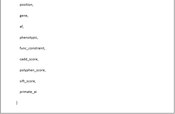 [9]- PrimateAI (variant damage prediction from PrimateAI, >= 0.7 is damaging), type:float