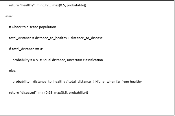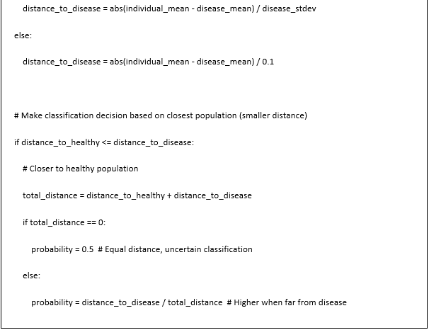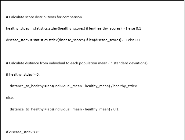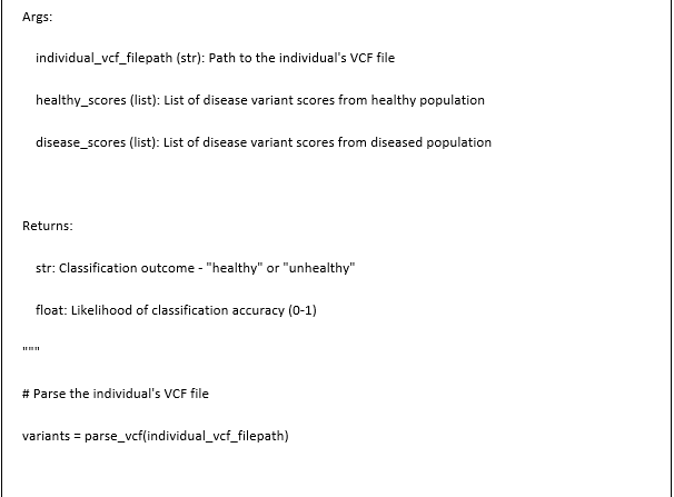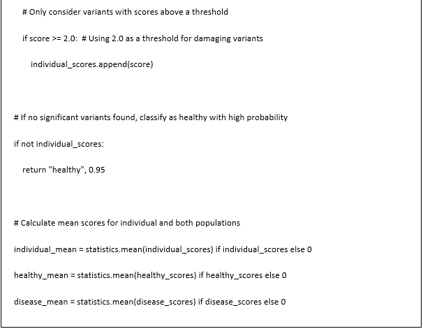 This code implements a genetic variant analysis pipeline with two main functions: assess_population_variation() and classify_individual(). It is noted that ‘assess_population_variation()’ command determines genetic variance across populations. This is done by analysing numerous VCF content, computing disease variant numbers for every individual's genetic difference, and then organising those ratings into two categories based on filename patterns indicating condition A or B. Repeat until desired outcome is reached. By receiving VCF file paths as well as an integer flag, the method may analyse all variations or simply those with sickness ratings higher than 2.0. In order to contrast situations, it generates two scoring lists. The `classify_individual()` function determines whether someone is probably healthy or diseased. It is based on their genetic profile. This function checks the variant score of the given samples against reference populations. Then, it starts parsing the VCF file of that person. It then computes disease variant scores. Only variants with a score equal or higher to a threshold (≥2.0) are considered. Then, it engages in a statistical comparison. Distribution of healthy and diseased population is compared to the individual’s mean score. Standard deviation distances are being used to classify the logic. It helps to decide which population the individual resembles more. Probability calculations reflect classification confidence. Higher probabilities mean greater certainty. The capacities on probabilities range from 0.5 (quite certain) to 0.95 (quite confident). The function handles edge cases. It classifies healthy if it does not find any significant variants, which gives 0.95 probability. For zero standard deviations, 0.1 is used as default. This avoids division errors. Both functions rely on previously defined helper functions: parse_vcf() to extract variant information from VCF files and disease_variant_score() to calculate pathogenicity scores based on multiple genetic parameters (allele frequency, phenotypic association, constraint scores, and damage prediction scores from CADD, PolyPhen, SIFT, and PrimateAI tools). The statistical processing leverages Python's statistics module to calculate means and standard deviations of score distributions. Together, these functions create a computational framework for population-level genetic analysis and individual disease risk assessment, implementing a methodical approach that balances multiple factors in evaluating genetic variants' potential contributions to disease, while incorporating statistical measures to quantify classification confidence.