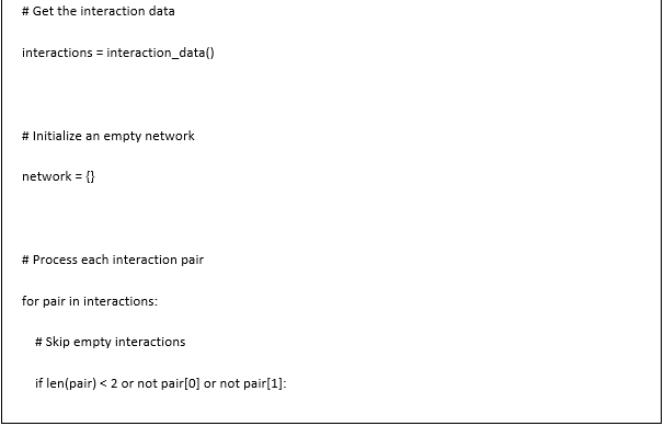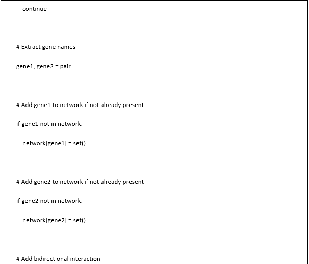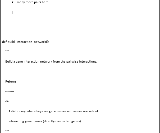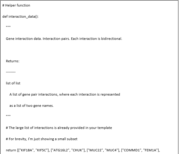1. A helper function named interaction_data() is defined in the code template file for this assignment. Calling this function returns a list of lists, with each sub-list containing the names of two interacting genes. Implement another function named build_interaction_network() that calls interaction_data() and uses the pairwise interactions to build a data structure that will contain the interaction network for all named genes. Consider all named interactions as bidirectional.