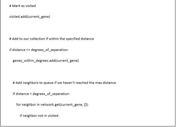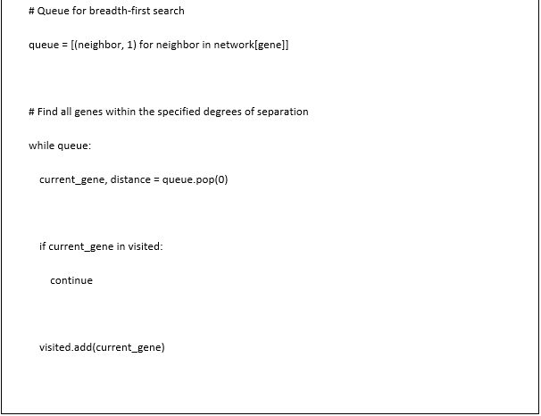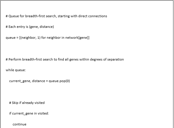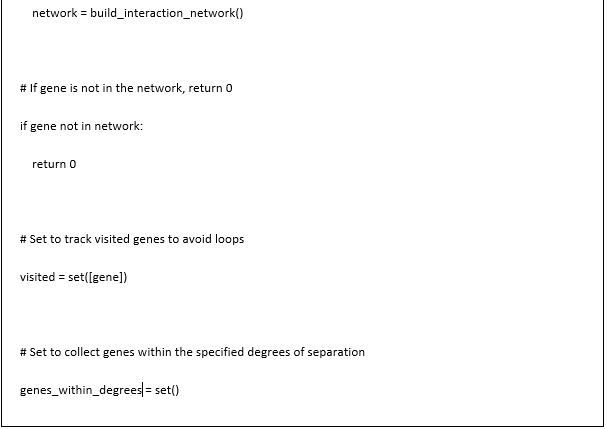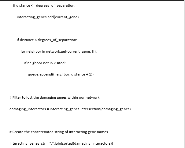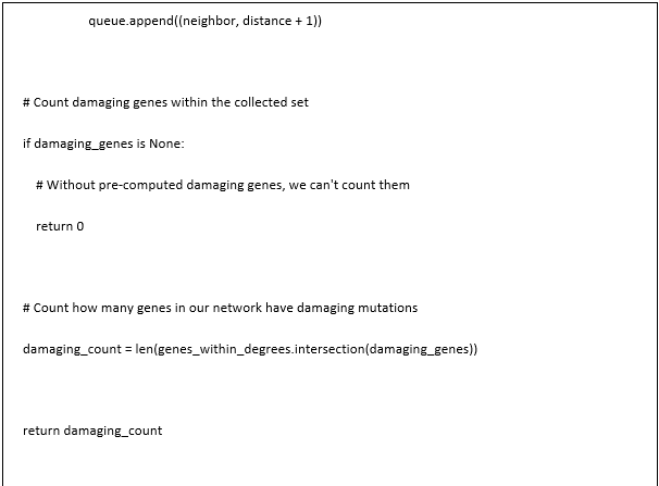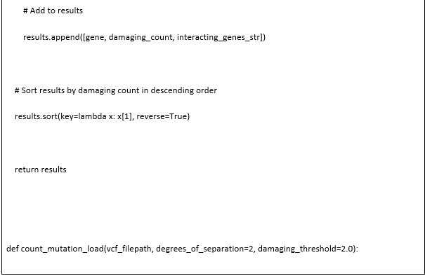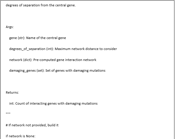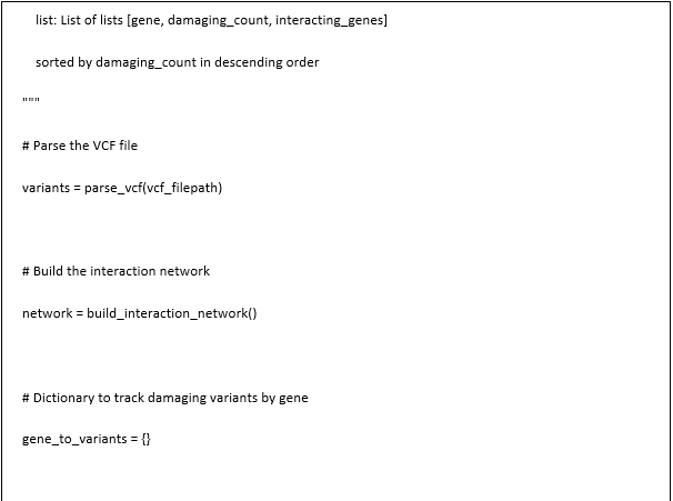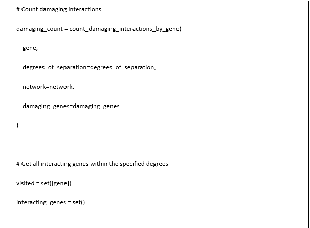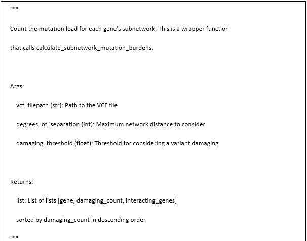 This code implements a gene interaction network analysis system through five interconnected functions focused on identifying potentially damaging genetic mutations within interaction networks. The framework begins with interaction_data(), which serves as a data provider returning a list of gene pair interactions where each interaction is represented as a two-element list containing gene names; this function essentially acts as a database of known gene-gene interactions. The build_interaction_network() function transforms these pairwise interactions into a comprehensive network structure represented as a Python dictionary where keys are gene names and values are sets of directly interacting genes, implementing bidirectional connections (if gene A interacts with gene B, then gene B also interacts with gene A) and handling empty interactions by skipping them. The core analytical capability is provided by count_damaging_interactions_by_gene(), which uses breadth-first search to explore a gene's interaction network up to a specified number of degrees away from the central gene, counting how many genes within this subnetwork contain damaging mutations; it tracks visited genes to avoid loops, maintains a collection of genes within the specified network distance, and ultimately intersects this collection with a pre-computed set of genes known to have damaging mutations. The calculate_subnetwork_mutation_burdens() function performs a comprehensive analysis by first parsing genetic variants from a VCF file, building the interaction network, identifying variants that exceed a specified damage threshold score (calculated using the previously defined disease_variant_score() function), and then for each gene with damaging variants, determining how many of its network neighbors (up to the specified degrees of separation) also have damaging mutations; the function returns a sorted list of results showing genes with the highest concentration of damaging mutations in their interaction neighborhoods, including both the count and a comma-separated list of the specific interacting genes with mutations. Finally, count_mutation_load() serves as a simple wrapper function that calls calculate_subnetwork_mutation_burdens() with the same parameters, providing a more concise entry point to the analysis. Together, these functions create a sophisticated pipeline for analyzing the distribution of potentially disease-causing mutations across gene interaction networks, allowing researchers to identify clusters or hotspots of mutations that might collectively contribute to disease through disruption of interconnected biological pathways.