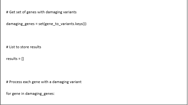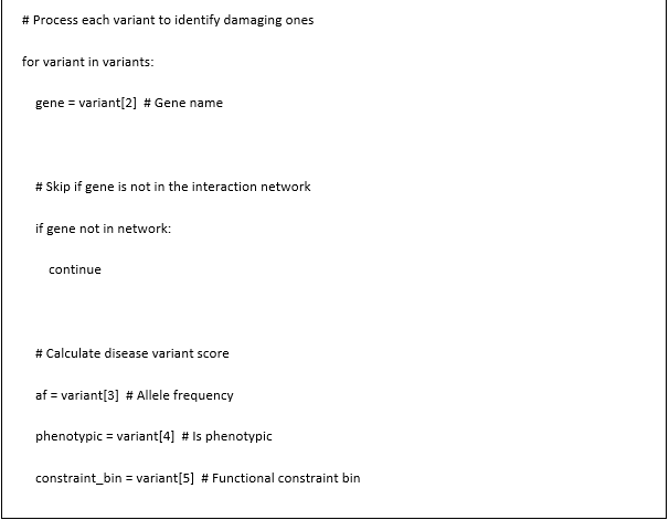 The steps provided in the current code are a full pipeline that facilitates the processing of VCF files to display genetic mutations in genetic variants analysis. It is a function used to parse VCF files as well as extract genetic variants including chromosome, position, allele frequency, being constrained, and predictive scores inclusive of CADD, PolyPhen, SIFT and PrimateAI. It converts organised but not formatted or normalized data into more suitable format for further analysis. The functions calculate_consensus_score() and disease_variant_score() predict pathogenicity by taking in multiple computational prediction tools as well as genetic parameters and using them to come up with disease risk score. To population analysis, there are two subroutines: assess_population_variation() that categorises people depending on the genetic variability relating to the disease, and classify_individual() that statistically compiles an individual profile against the healthy and affected populations. The reason why such statistical indicators as mean and standard deviations may be used in classifying the for university assignment help confidence level is because they provide a very strong means of comparison. Additionally, the pipeline includes the interaction_data(), build_interaction_network(), and count_damaging_interactions_by_gene() in the advanced configuration for gene interaction network analysis to determine mutations and associated interacting genes in the assigned network. This system, based on computational genomics and use of prognosis from machine learning together with statistics, provides for a powerful system to assess risks of hereditary diseases and propensity of mutations to be pathogenic, and to detect mutation ‘hotspots’ in networks of genes that interact with one another.