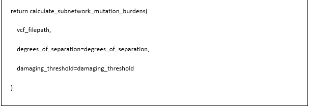 calculate_subnetwork_mutation_burdens(), which will take arguments of a VCF filename and a degrees_of_separation integer value (default=2). This function will iterate through every gene in the input VCF file that contains a damaging variant. For each of these mutated genes, the function will call other functions to count the number of damaging variants within the specified degrees of separation. The function will return a list of lists, ranked in descending order by the mutation count for each central gene. The fields of each sub-list will be: