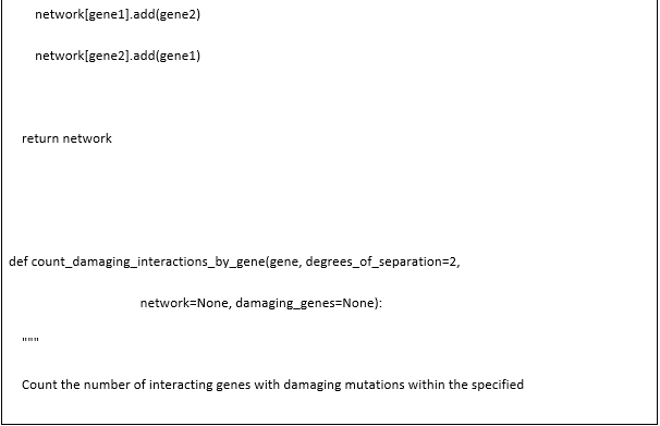 2. Implement a function named count_damaging_interactions_by_gene() that takes named arguments of gene (the name of the gene, type:str) and degrees_of_separation (type:int). By default, please use degrees_of_separation=2. The function takes two optional named arguments, network and damaging_genes. Both arguments allow precomputed information to be passed to the function, to avoid the need to recompute this information for every call. The network argument allows a pre-computed interaction network to be passed in. The damaging_genes argument allows a pre- computed data structure of genes containing a damaging mutation/variant to be passed to the function. The return value of this function will be an integer count of the number of interacting genes containing a deleterious mutation (from the data structure created in build_interaction_network()) within the specified degrees of separation from the central, named gene. Multiple damaging variants in a single gene (if present) should only be counted once. If any gene present in the input VCF file is not also present in the interaction network data, please exclude these genes from further analysis.