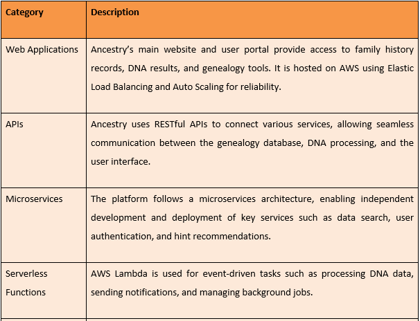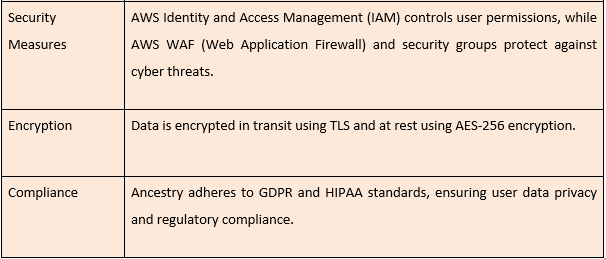 The table shows which are the key applications and services on Ancestry’s cloud infrastructure, and security and compliance. The primary user interface is exposed through the web application, where the developer can interact seamlessly with APIs and microservices (Lamothe et al., 2021). With AWS Lambda, there is no need for maintaining servers that are used for background processing, thus reducing server costs. IAM helps to secure data protection along with firewalls and the associated encryption protocols. Compliance is ensured by such frameworks as GDPR and even HIPAA on the part of Ancestry, safeguarding user privacy. As part of integrating these technologies, Ancestry can provide its customers with a secure, scalable, and efficient platform.