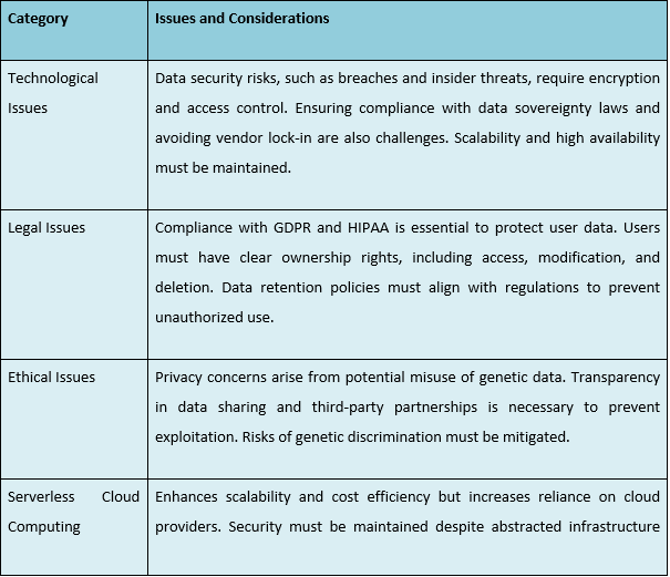 Ancestry handles sensitive amounts of personal and genetic data, and the handling of data in the cloud creates its own technological, legal, and ethical problems. Data security is one main issue related to technological matters. Strong encryption of transit and at rest is needed to protect DNA records and family histories. The risks remain very much the same: data breaches, insider threats, and all of those remaining misconfigurations (Banerjee, 2023). Also part of this is the need for data sovereignty since cloud services are spread across numerous countries, and therefore, they must be in compliance with jurisdictional laws. Migrating from a vendor such as AWS can be complex and costly.